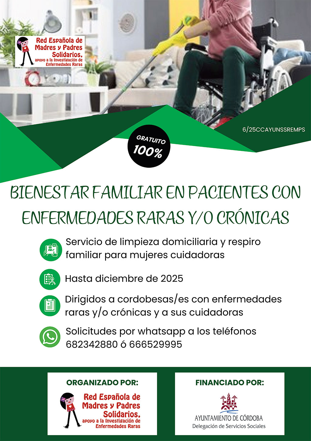 Gracias a esta financiación, durante 2025 se ha desarrollado en Córdoba el proyecto “Bienestar Familiar en Pacientes con Enfermedades Raras y/o Crónicas”, que ha beneficiado directamente a 100 personas. La iniciativa ha incluido la evaluación de necesidades del hogar, servicio de limpieza y ordenación domiciliaria, sesiones de respiro para la cuidadora informal y acciones de visibilización del cuidado no remunerado.